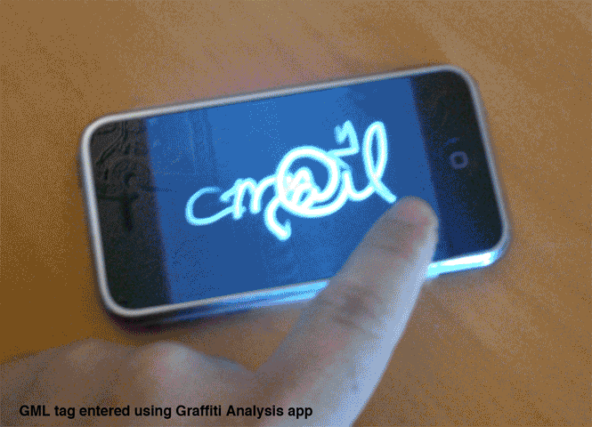 Graffiti Markup Language (.gml) is a universal, XML based, open file format designed to store graffiti motion data (x and y coordinates over time). The format is designed to maximize readability and ease of implementation, even for hobbyist programmers, artists and graffiti writers. Beyond storing data, a main goal of GML is to spark interest surrounding the importance (and fun) of open data and introduce open-source collaborations to new communities. GML is intended to be a simple bridge between ink and code, promoting collaborations between graffiti writers and hackers. A wide variety of applications for capturing, displaying and disseminating GML have been developed.