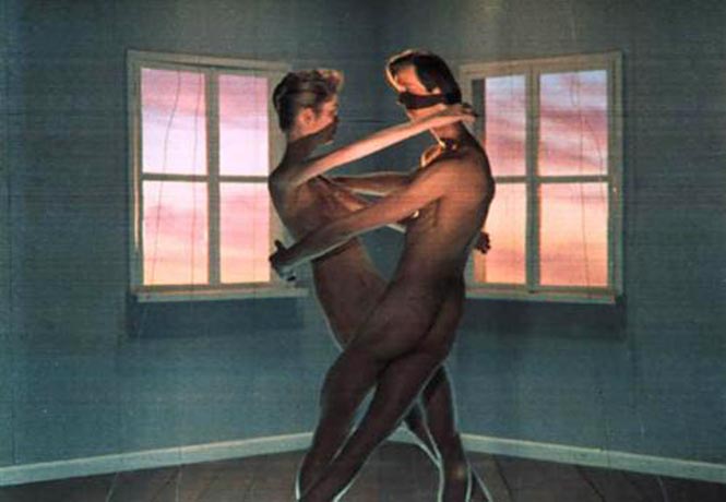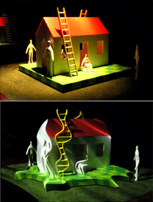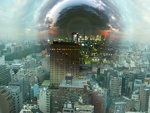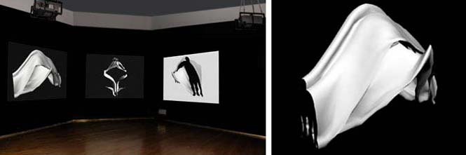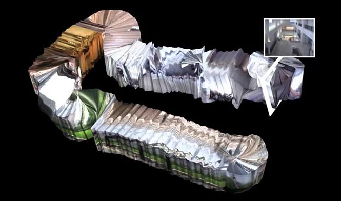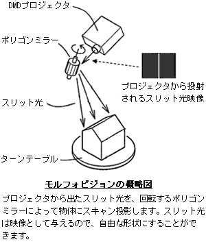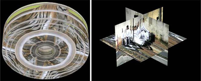 In Iwai's Morphovision, a (real, not virtual!) three-dimensional composite form is assembled from many thin slit-scans of a rapidly rotating, three-dimensional house sculpture. The slices are created by passing a narrow beam of light over the rotating house; they are fused into a single three-dimensional form by the mind and eye, through the perceptual phenomenon known as persistence of vision.
