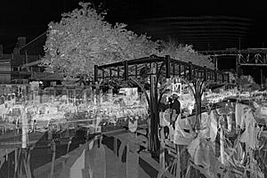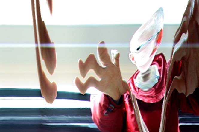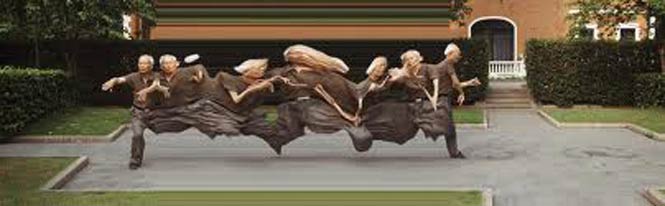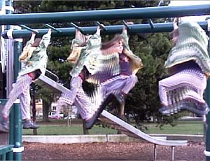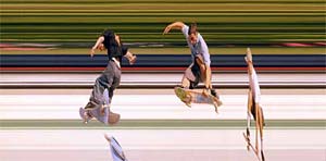 Using a Processing sketch written by Don Whitaker, Horne uses slit-scans to create this image of a ballet dancer performing a 720° jump. He writes, "Each frame of the processed video is a horizontal stack of 1-pixel vertical slices of a video image. The left of the frame is the beginning of the video clip, the right side is the end. The animation effect is created by moving the location of the vertical slice from the left of the original video frame to the right. In effect, swapping time and space."