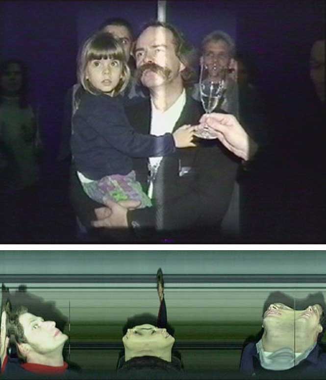 Murphy writes: "If we show a video on screen, we are displaying the passage of time. If we mount a camera above the screen, we can measure local brightness (light) in the form of a black and white image. As the camera is pointed outwards, the viewers provide the brightness. We then map brightness to time, where if the light is bright, we show the most recent part of the video, and if it is dark, we show earlier video. This is computed on a per-pixel basis."