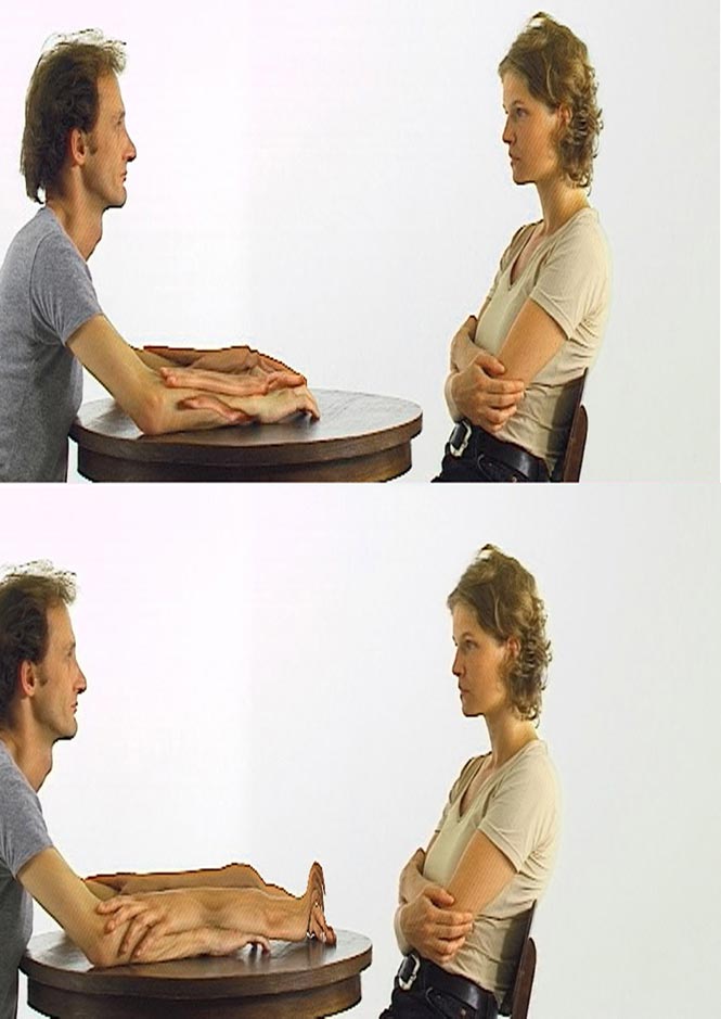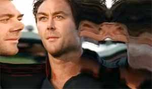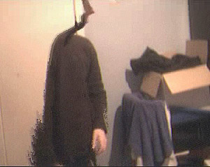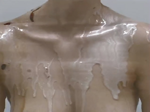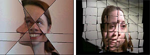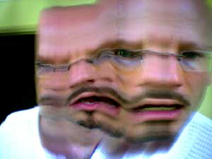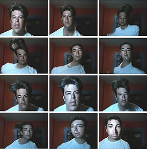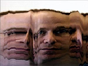 Canadian computer vision programmer and self-described "vfx junkie" Kevin Atkinson documents himself using an interactive slit-scan system in which his movements are playfully augmented by wiggles in the image plane. The effect is as if his image were projected onto the surface of a liquid wherein ripples are coupled to his every motion. He accomplishes the effect in the video by "carving into the image stack with a gaussian surface, whose center is tracked to face-position." Atkinson favors the video stills seen here, which are reminiscent of the paintings of Lucian Freud and Francis Bacon.