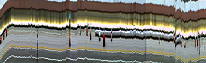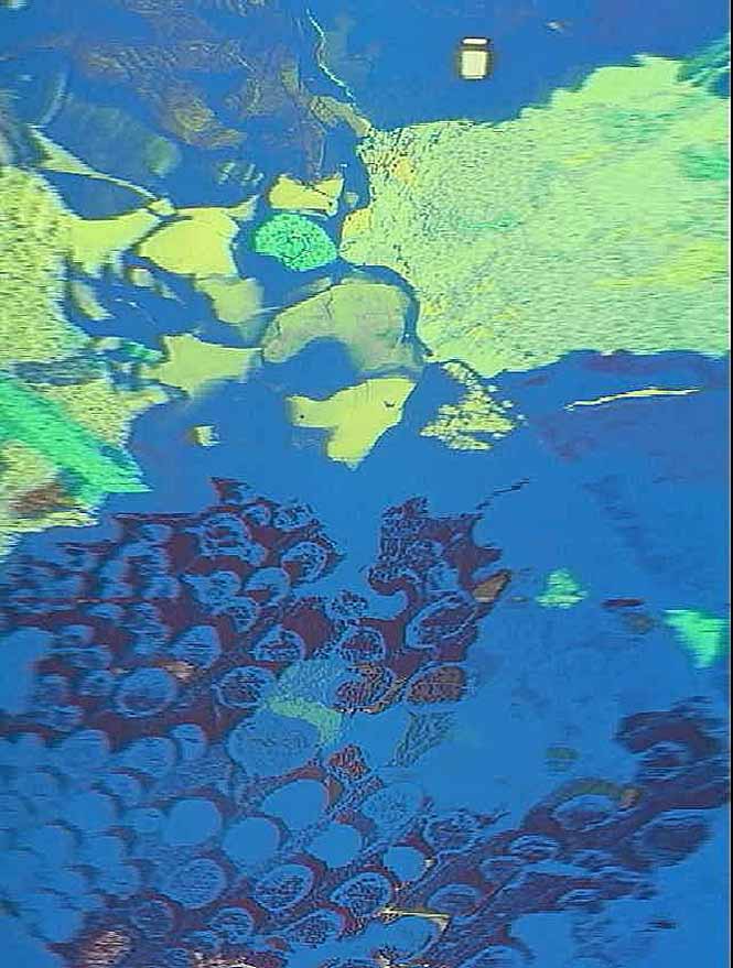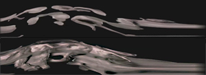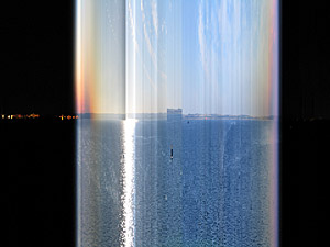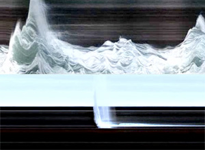 Don Whitaker experiments with horizontally-moving slit-scan techniques, using his own nature videos as source files. Whitaker's application of slit-scans to ocean waves produces an arresting image of a turbulent alien sea. Whitaker writes, "I'm intrigued by slitscan photography and other visual/temporal shenanigans. [I] love the abstract, moving shapes and colors - especially the way the ocean waves are transformed, yet still recognizable."