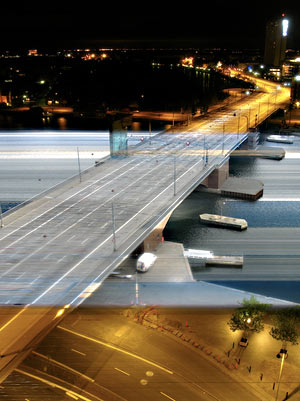 Using his Panoscan MK3 camera Bradford Bohonus, of Bohonus Virtual Reality Photography, creates these layered composites of panoramic slit scans by stacking about 50 high-resolution panoramas of a Seattle location shot at several different times.